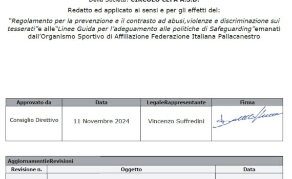 Con Verbale in data 11 Novembre 2024 del Consiglio Direttivo del Circolo CEFA A.s.d. è stato approvato ed adottato il “Modello organizzativo e del codice etico in materia di Safeguarding ai sensi dell’articolo 16 del […]