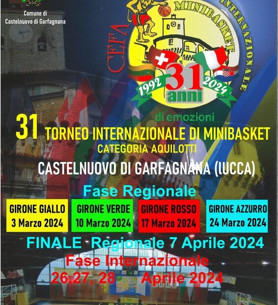 Sono stabilite e definite le date della 31^ Edizione del Torneo Internazionale di Minibasket , riservato alla Categoria Aquilotti (nati nel 2013, 2014 e ammessi 2015) organizzato del CEFA Basket , che si svolgerà a Castelnuovo di Garfagnana, (Lucca) nella sua ormai tradizionale formula , che vede una PRIMA FASE A CARATTERE REGIONALE, ove potranno partecipare le prime 16 squadre provenienti dalla Toscana che faranno pervenite la loro scheda di Iscrizione, ed una SECONDA FASE A LIVELLO INTERNAZIONALE